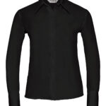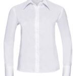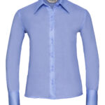 Made using the newest technologies of non-iron fabric that stays wrinkle free and keeps the wearer looking and feeling smart all day long. Contemporary fit combined with contemporary designed features. Stylish and relaxed long edged collar. Fashionable twin button fastening. Shaping at the waist for flattering feminine silhouette. Long, squared edge flared cuff with single button fastening and option for cuff links. Rounded hem. WRAP certified.
