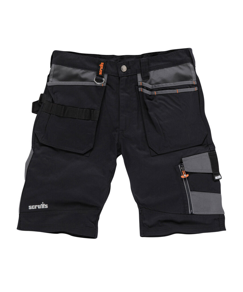 Hard-wearing work shorts designed for lasting comfort. Regular fit for classic look. Lightweight twill fabric with heavy-duty canvas pocket reinforcements and triple-stitched seams for durability. Features cargo pocket, rule pocket, mobile phone socket and secure zipped pocket. Hammer loop, tool loops and D-ring for transporting tools and accessories while on the job. YKK zipped fly. Certified Sedex.