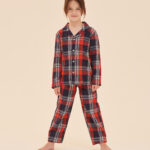 Woven tartan lounge set with plain hem. Shirt with a pyjama collar and pearlised button front, and bottoms with a full elasticated waist. Tear-out label. .