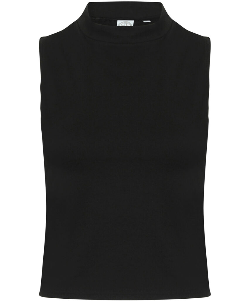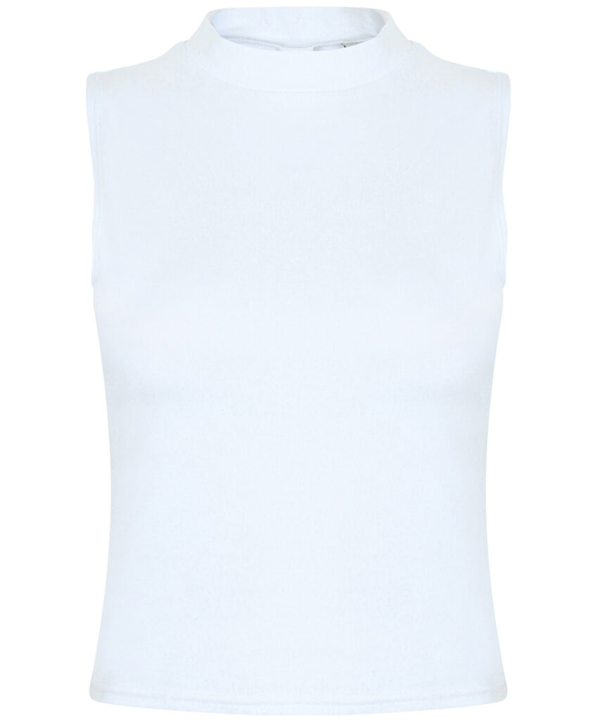 High fashion. High impact. A fashion throwback, this high neck crop vest style is in high demand again. Soft-stretch single Jersey fabric with self-fabric funnel-neck and twin-needle stitching at armholes and hem ensure a premium finish. Features tear-out label for easy rebranding.