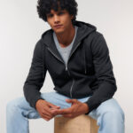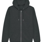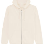 The unisex iconic zip-through hooded sweatshirts in 350gsm brushed fleece. Crafted from premium 85% organic cotton, and 15% recycled polyester. Featuring premium matt silver trims and zip, with clean herringbone internal tape finishing at zip, double fabric hood lining, and twin-needle top stitching.