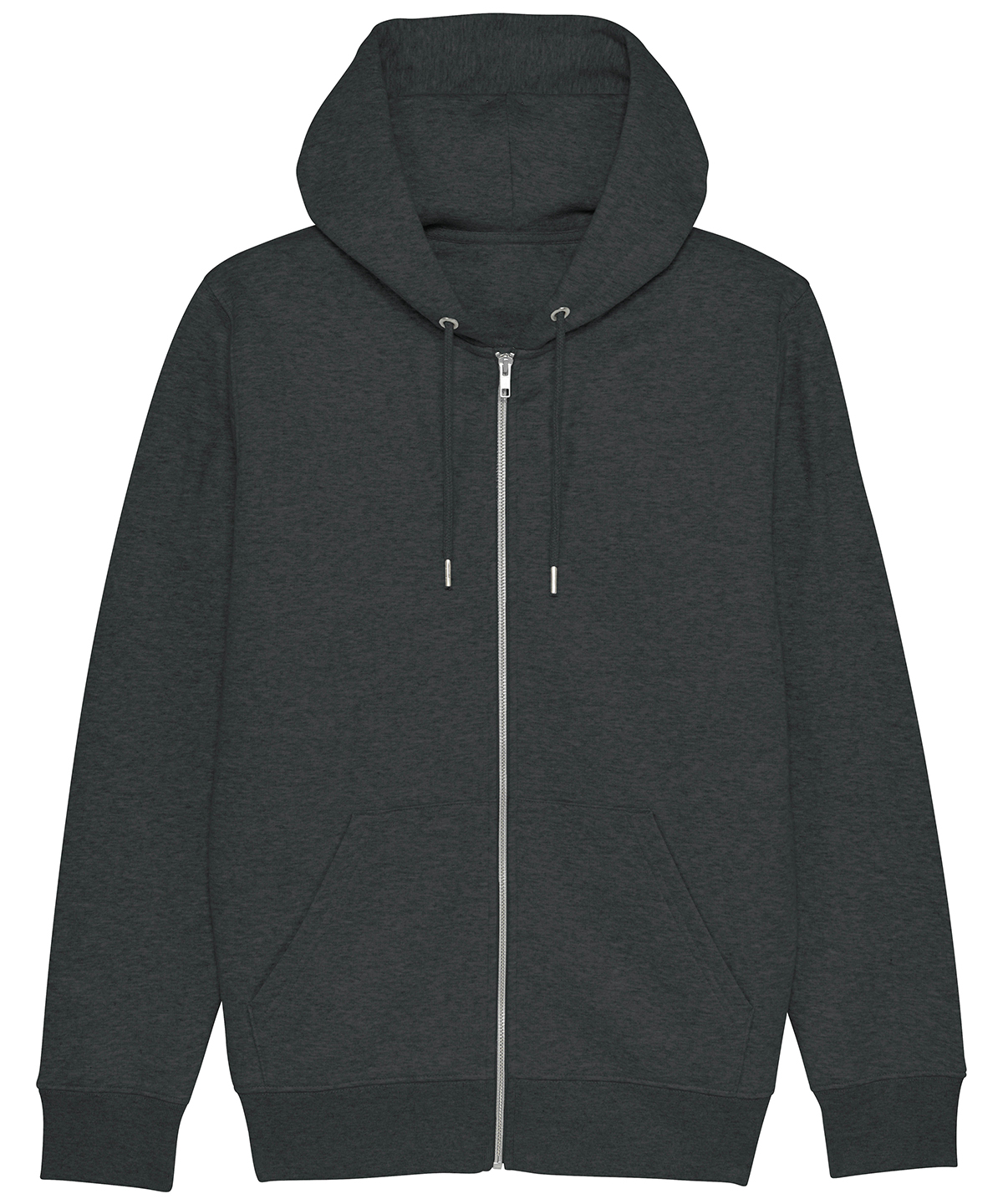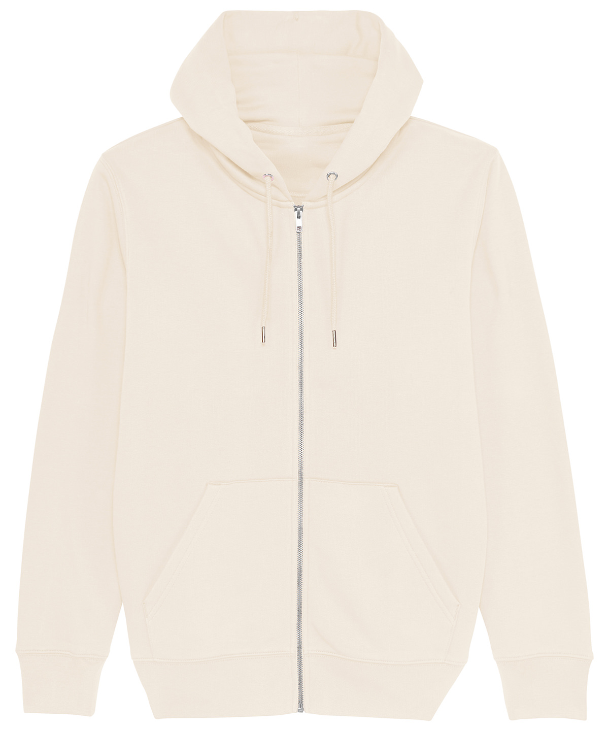 The unisex iconic zip-through hooded sweatshirts in 350gsm brushed fleece. Crafted from premium 85% organic cotton, and 15% recycled polyester. Featuring premium matt silver trims and zip, with clean herringbone internal tape finishing at zip, double fabric hood lining, and twin-needle top stitching.