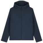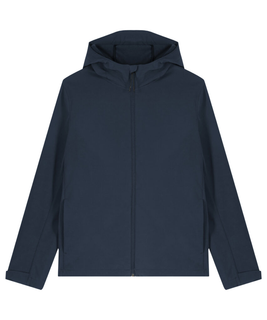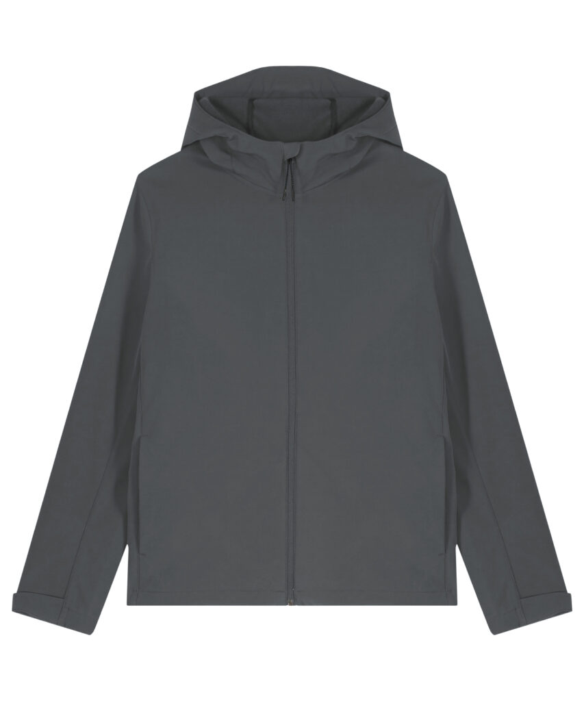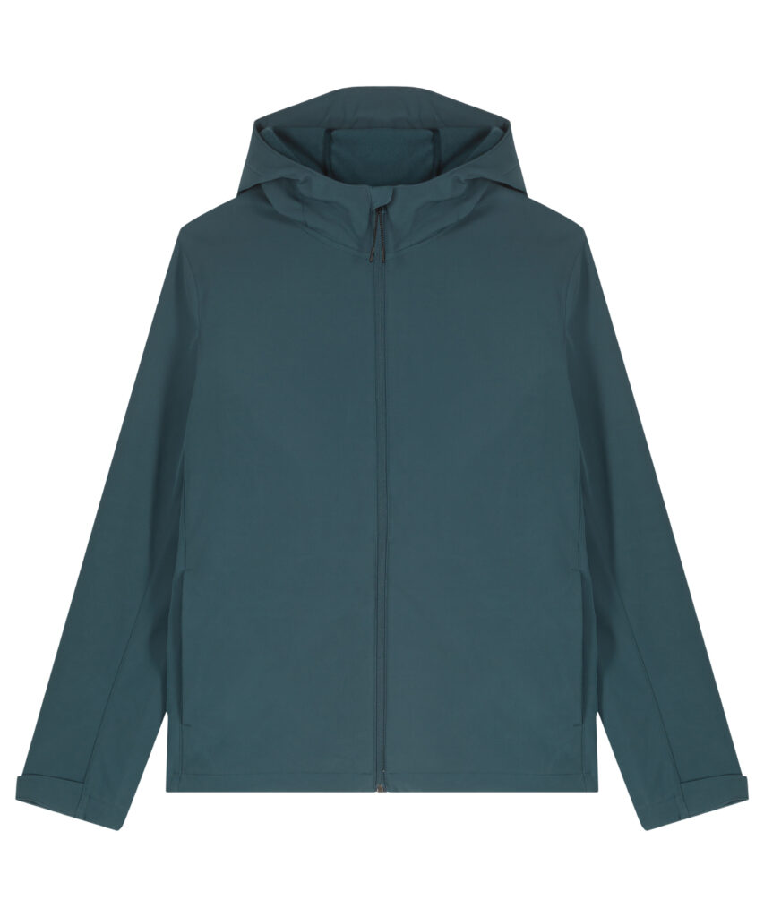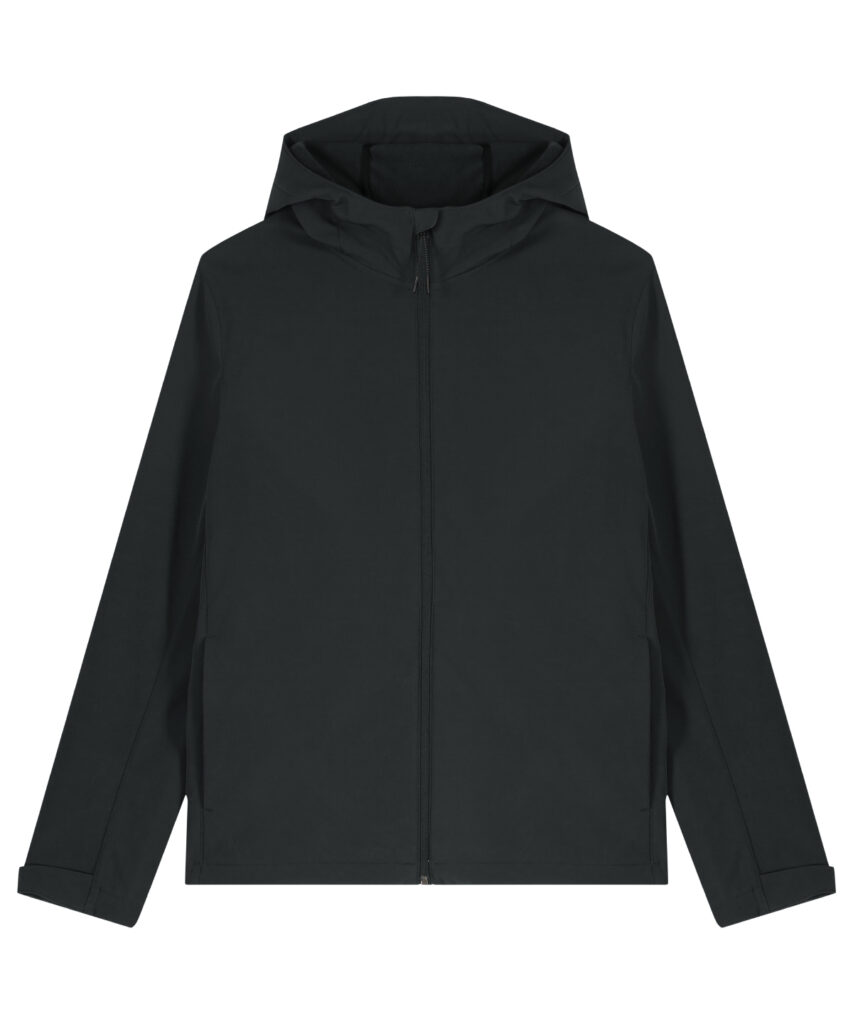 Mens hooded softshell jacket, medium fit, with set-in sleeve and a high collar with panelled hood. Hood opening and bottom hem with adjustable plastic stopper and elastic cord. Reverse nylon zip at centre front. Zipped welt pockets with reflective elastic puller. Bonded three-layer fabric with internal membrane . Fully bonded fleece inside layer. Side panels and stretch for better shape. Adjustable hook and loop sleeve opening. Inside seams finished with recycled binding. Water-repellent up to 10,000mm, breathability up to 3000G/M2/24hrs allowing perspiration to escape. Windproof. Bionic ECO DWR (durable, water-repellent) finish.