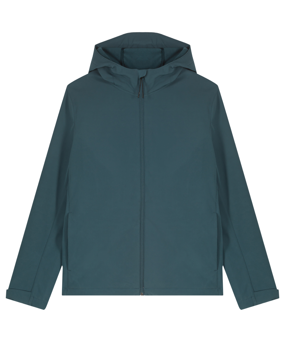 Mens hooded softshell jacket, medium fit, with set-in sleeve and a high collar with panelled hood. Hood opening and bottom hem with adjustable plastic stopper and elastic cord. Reverse nylon zip at centre front. Zipped welt pockets with reflective elastic puller. Bonded three-layer fabric with internal membrane . Fully bonded fleece inside layer. Side panels and stretch for better shape. Adjustable hook and loop sleeve opening. Inside seams finished with recycled binding. Water-repellent up to 10,000mm, breathability up to 3000G/M2/24hrs allowing perspiration to escape. Windproof. Bionic ECO DWR (durable, water-repellent) finish.