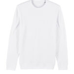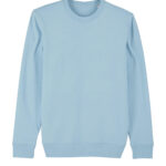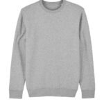 Set-in sleeve. 1×1 rib at neck collar, sleeve hem and bottom hem. Inside herringbone back neck tape. Self-fabric half-moon at back neck. Single-needle topstitch at neck collar. Armhole, sleeve hem and bottom hem with twin-needle topstitch. Unisex, medium fit, long sleeve, round-neck. 85% organic ringspun combed cotton, 15% recycled polyester. Brushed sweatshirt. Fabric washed, light sueded.