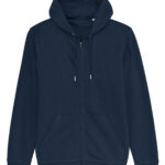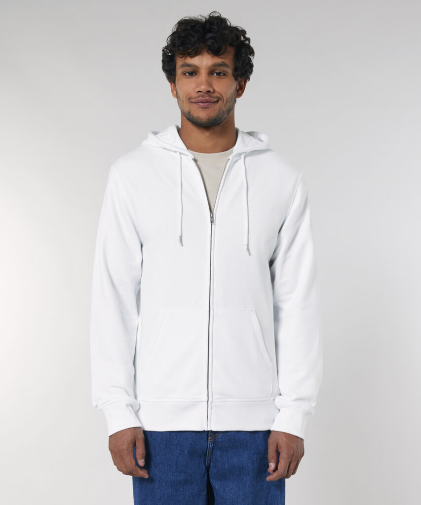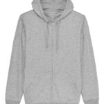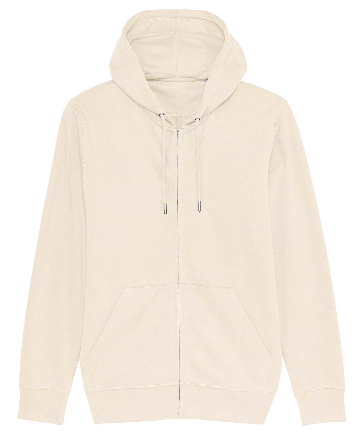 The essential easy-to-wear unisex zip-through hoodie sweatshirt in 300gsm terry crafted from premium 85% organic cotton and 15% recycled polyester and featuring single Jersey hood lining, flatlock stitching, and matt silver trims.