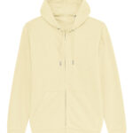 Set-in sleeve. Lined hood in single Jersey. Round drawcords in matching body colour with metal tipping. Herringbone tape at inside back neck and at inside of zipper. Metal zipper and eyelets. Covered zipper at centre front. Self-fabric half-moon at back neck. 1×1 rib at sleeve hem and bottom hem. Flatlock topstitch on all seams. Kangaroo pocket with flatlock topstitch. Unisex, medium fit, long sleeve, round-neck with hood. 85% organic ringspun combed cotton, 15% recycled polyester. Terry sweatshirt. Fabric washed, light sueded.