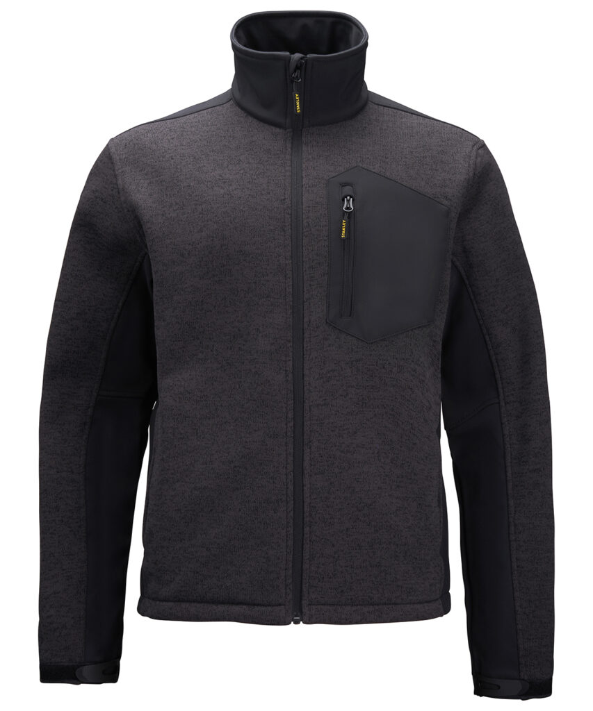 Zip-through knitted fleece with zipped chest pocket and soft shell inserts. Funnel neck. Knitted fabric base. Adjusted cuffs. UKAS certified. ISO certified.