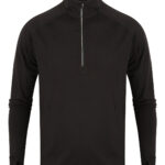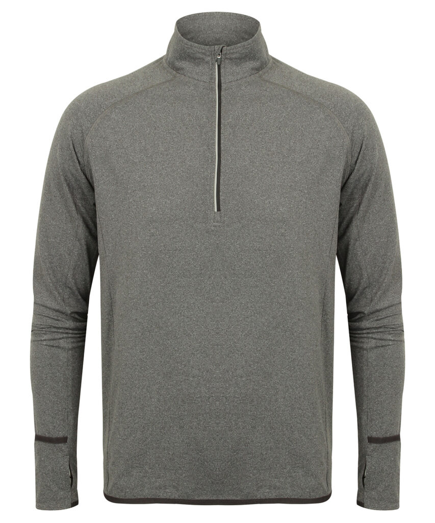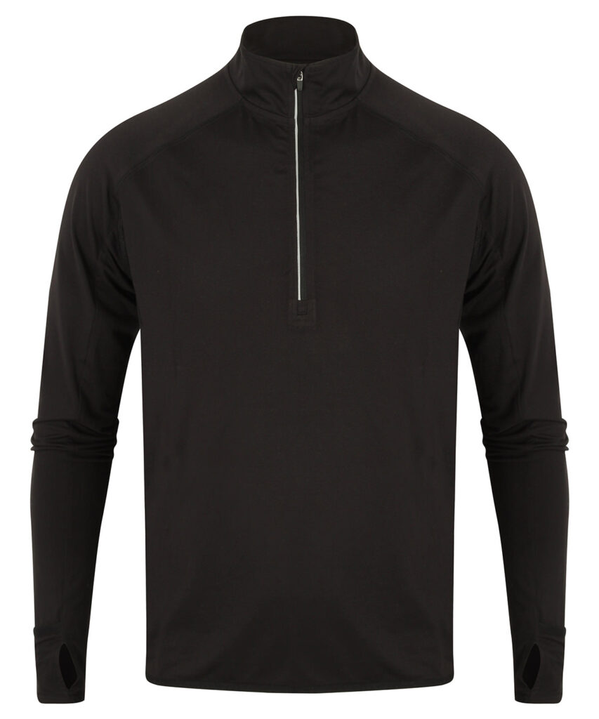 zip Jersey top with wicking finish. Long sleeves with thumbhole and fold over cuffs. Elasticated binding on cuffs and hem. Raglan shoulder seams with flatlock stitching and reflective dots detail on back of garment. 1/4 length zip with reflective trim and semi-automatic lock zip slider. Stand up self-fabric collar. Side panels. Key pocket on left back panel seam with concealed zip and inner headphone access hole. Tombo tear-out label. BSCI certified.