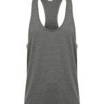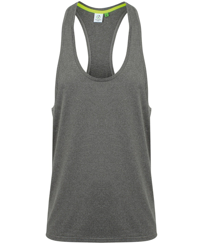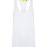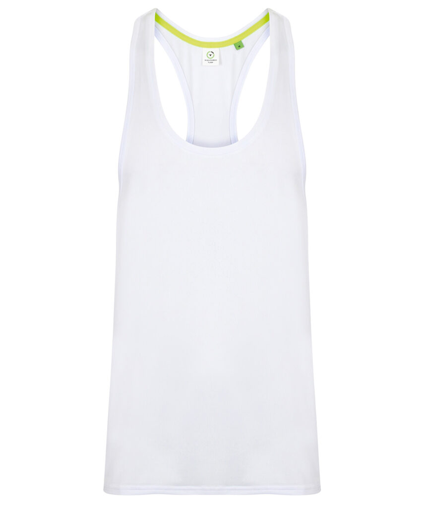 Shaped work out vest, lightweight soft hand feel fabric, self fabric binding, tear-out label. BSCI certified.