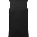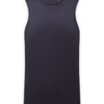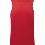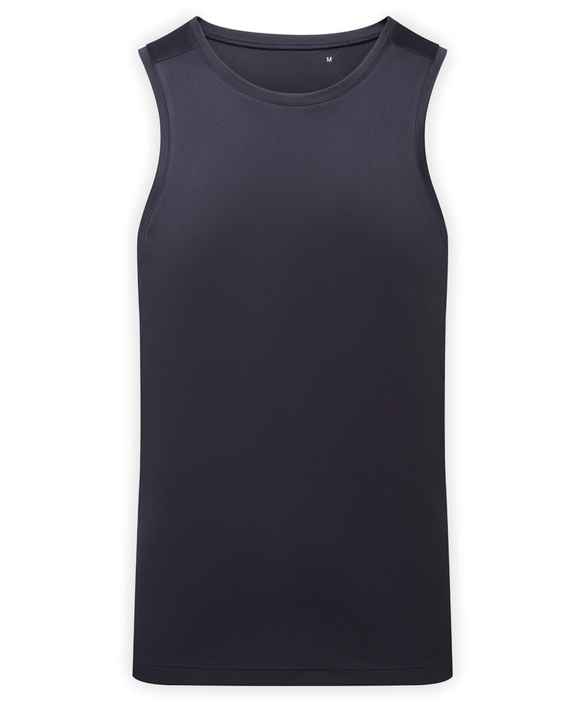 Performance vest. Cationic-dyed. Certified recycled polyester. Wicking fabric. Stretch. Lightweight. Dropped hem. Forward shoulder detail. Crew neck. Smooth finish.