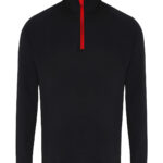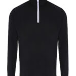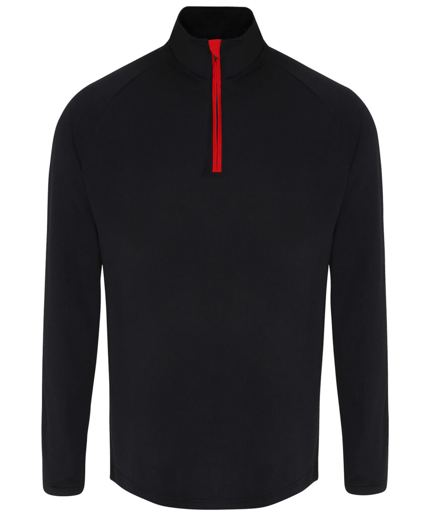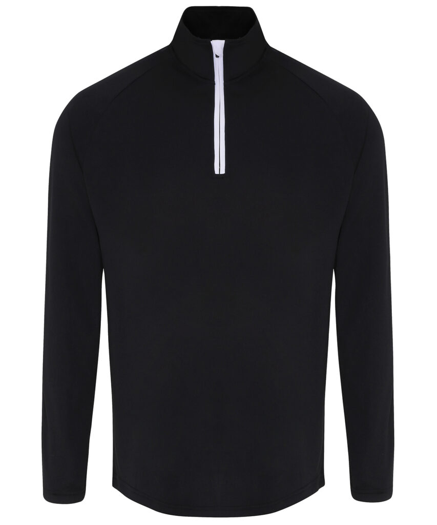 Contrast zip. Long sleeves. Stretch. Twin-needle stitching. Wicking fabric. We recommend using block out vinyl and inks.Product contains no branded neck or waist label. Removable Kimble or looped garment tags. Inner seam label holds important product information on one label with a second label containing brand information which can be cut-away.