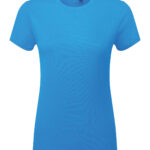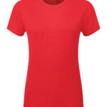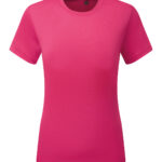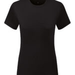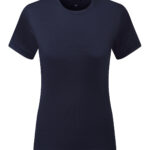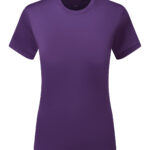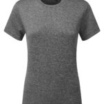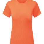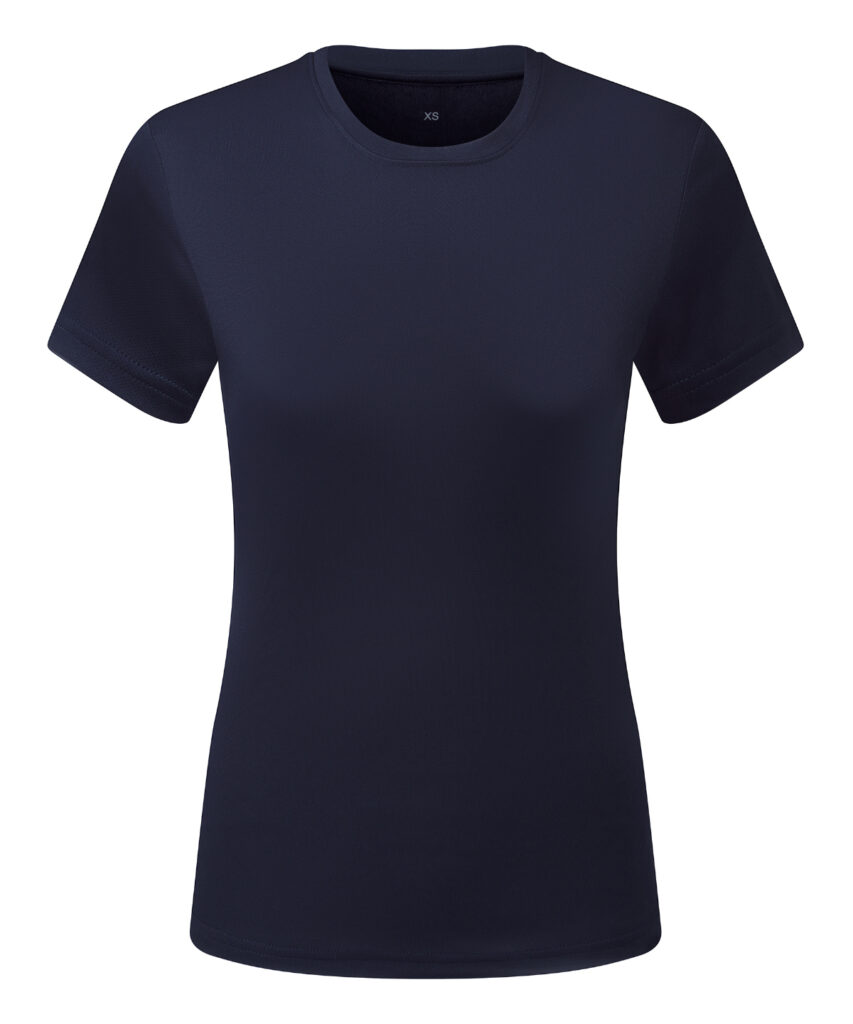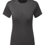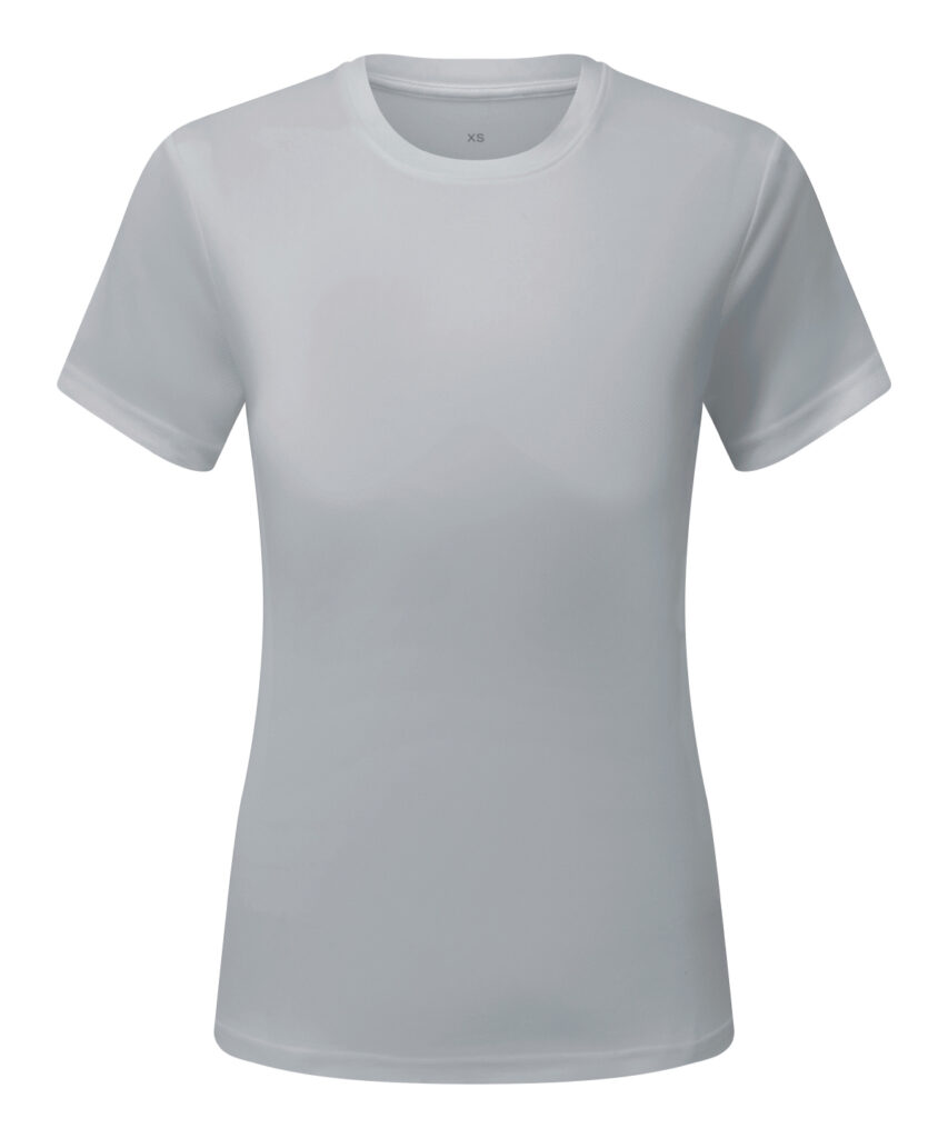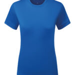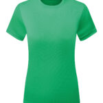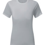 Performance T-shirt. Cationic dyed. Recycled polyester. Wicking fabric. Stretch. Crew Neck. Short Sleeve. Lightweight. Feminine fit. Twin-needle stitching on hem and arms. Textured fabric. Product contains no branded neck or waist label. Removable Kimble or looped garment tags. Inner seam label holds important product information on one label with a second label containing brand information which can be cut-away.