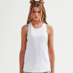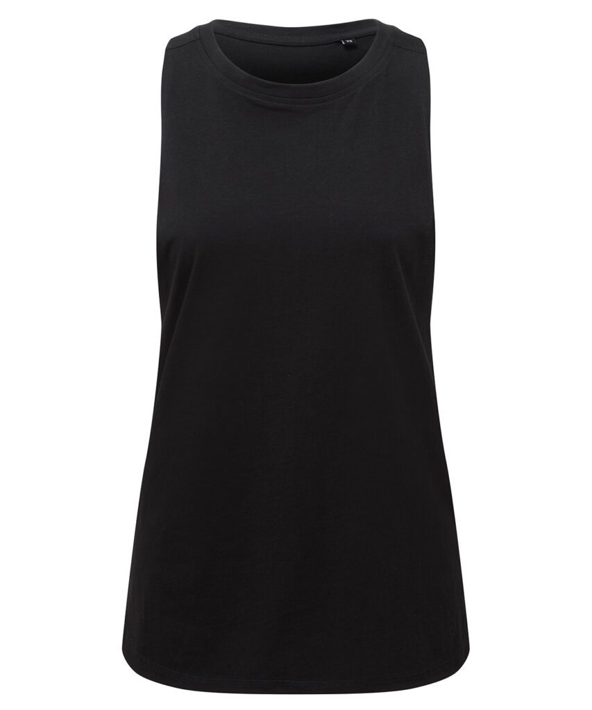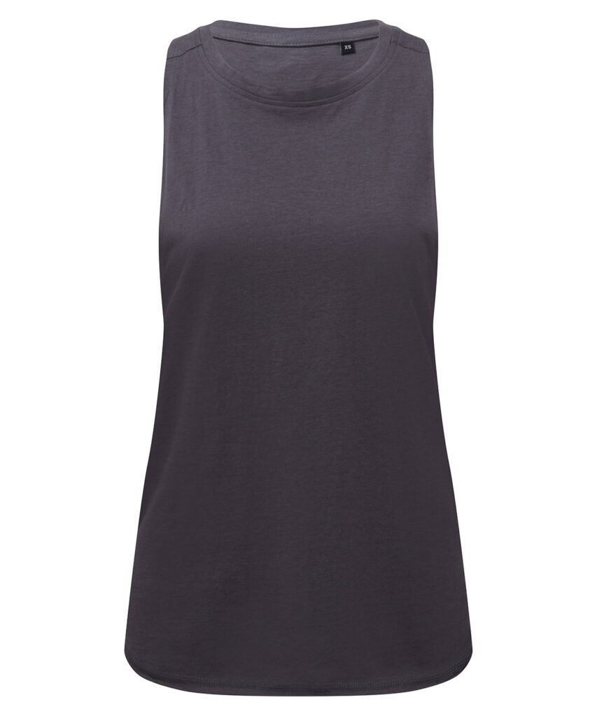 Crew neck tank top. Organic cotton. Deep-drop armholes with racerback. Curved hem detailing. We recommend using block out vinyl and inks.Product contains no branded neck or waist label. Removable Kimble or looped garment tags. Inner seam label holds important product information on one label with a second label containing brand information which can be cut-away.