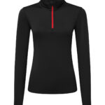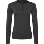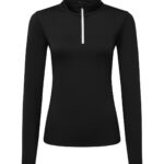zip design. Long sleeves. Stretch. Recycled polyester. Wicking fabric. Brushed inner. The product contains no branded neck or waist label. Removable kimble or looped garment tags. The inner seam label holds important product information on one label with a second label containing brand information which can be cut-away. We recommend using block out vinyl and inks.