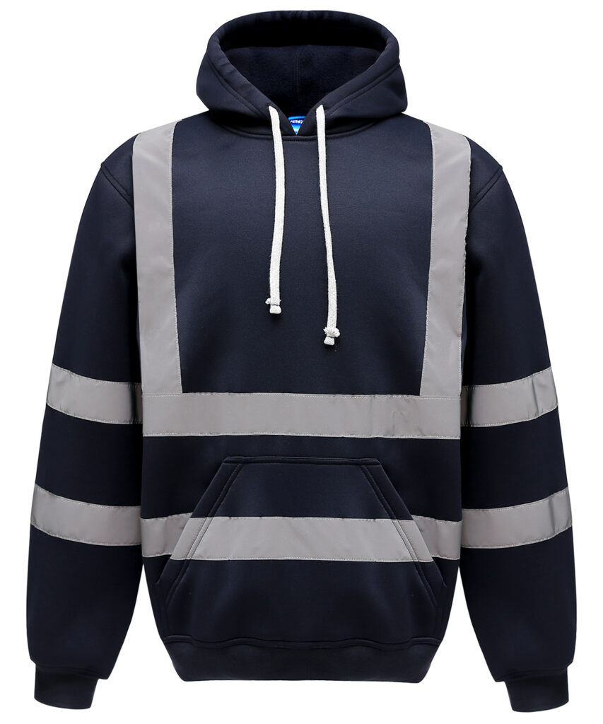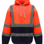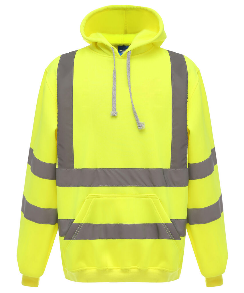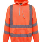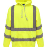 Hi-Vis conforms to EN ISO20471 Class 3; Made of water-repellent anti-pill single jersey knitted soft-feel polyester fabric; Two 5cm width reflective tapes around the body and arms, and one over each shoulder; Attached hood with draw cord adjustment; Taped back neck for extra comfort; Drop shoulder; Knitted ribbed cuffs and waistband; Front kangaroo pocket; Twin needle stitching throughout;.