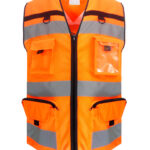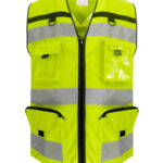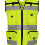 Heavy-duty, hi-vis ripstop tool vest with multiple pockets for convenience at work. Two double pockets accessed from the top with zip and hook and loop closure. Double D rings. Chest pockets with flap closure and pulls. ID card display. Adjustable hem with two press buttons. Also available with open mesh on the bottom to provide better breathability and comfort in hot working environments and seasons. Conforms to EN ISO20471:2013 Class 2. Large decoration area on the back. Certified Sedex and OEKO-TEX.