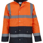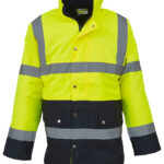 Conforms to EN ISO20471:2013 Class 3 and EN343:2003 + A1:2007 Class 3.1 against foul weather; Hi Vis Orange/Navy conforms to RIS-3279-TOM; Waterproof PU coated 300D Polyester with 190gsm quilted padding and Nylon lining; Two 5cm 3M reflective tapes around the body and arms, and one over each shoulder; Navy contrast helps to provide a corporate image and hide scuff marks; Heavy duty zip under the studded storm flap; Two outer pockets with storm flaps; Knitted storm-cuffs in the sleeve ends; Concealed hood with draw cord; Inside breast pocket; Stitched and taped seams to ensure waterproof; Matching trousers, codes HVS461 and HVS462 and HVS463.