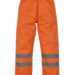 Conforms to EN ISO20471:2013 Class 1, EN343 against foul weather and RIS-3279-TOM. Approved for railway industry. 100% waterproof Polyester with Oxford PU coating. Two 5cm wide reflective bands around lower legs. Elasticated waistband. Stitched and taped seams. Snap buttons on the bottom for adjustment. More colours available, code HVS461 & HVS463. Matching jackets, code HVP211, HVP300 & HVP303.