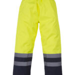 Conforms to EN ISO20471:2013 Class 1, EN343 against foul weather. Orange/Navy also conforms to RIS-3279-TOM and approved for railway industry. Navy contrast helps to provide a corporate image whilst disguising dirt around the hem area. 100% waterproof Polyester with Oxford PU coating. Two 5cm wide reflective bands around lower legs. Elasticated waistband. Stitched and taped seams. Snap buttons on the bottom for adjustment. More colours available, code HVS461 & HVS462. Matching jackets, code HVP211 & HVP300.
